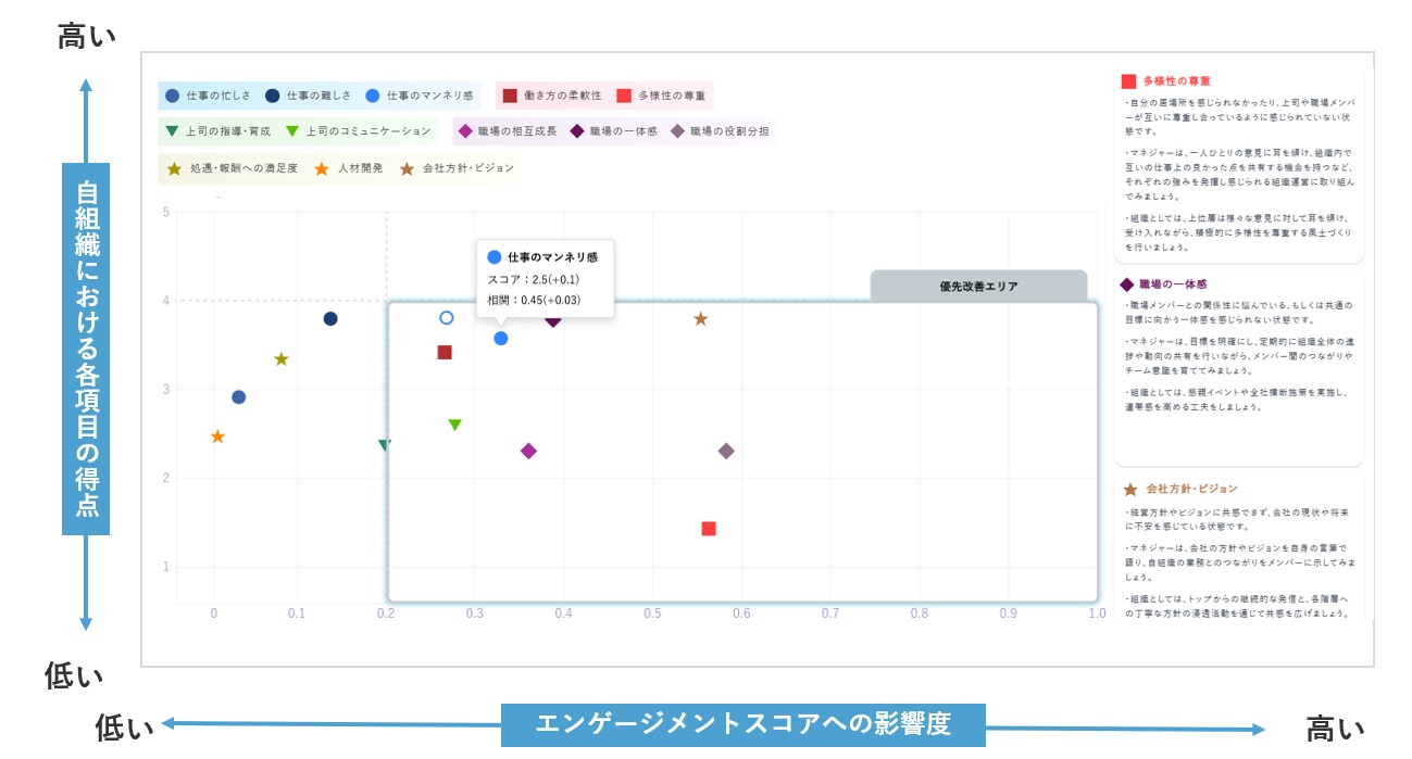 エンゲージメントに影響する要因を可視化され、優先順位をつけて取り組むべき課題が視覚的に分かります。また、現場と人事それぞれに打ち手のアドバイスを提示します。