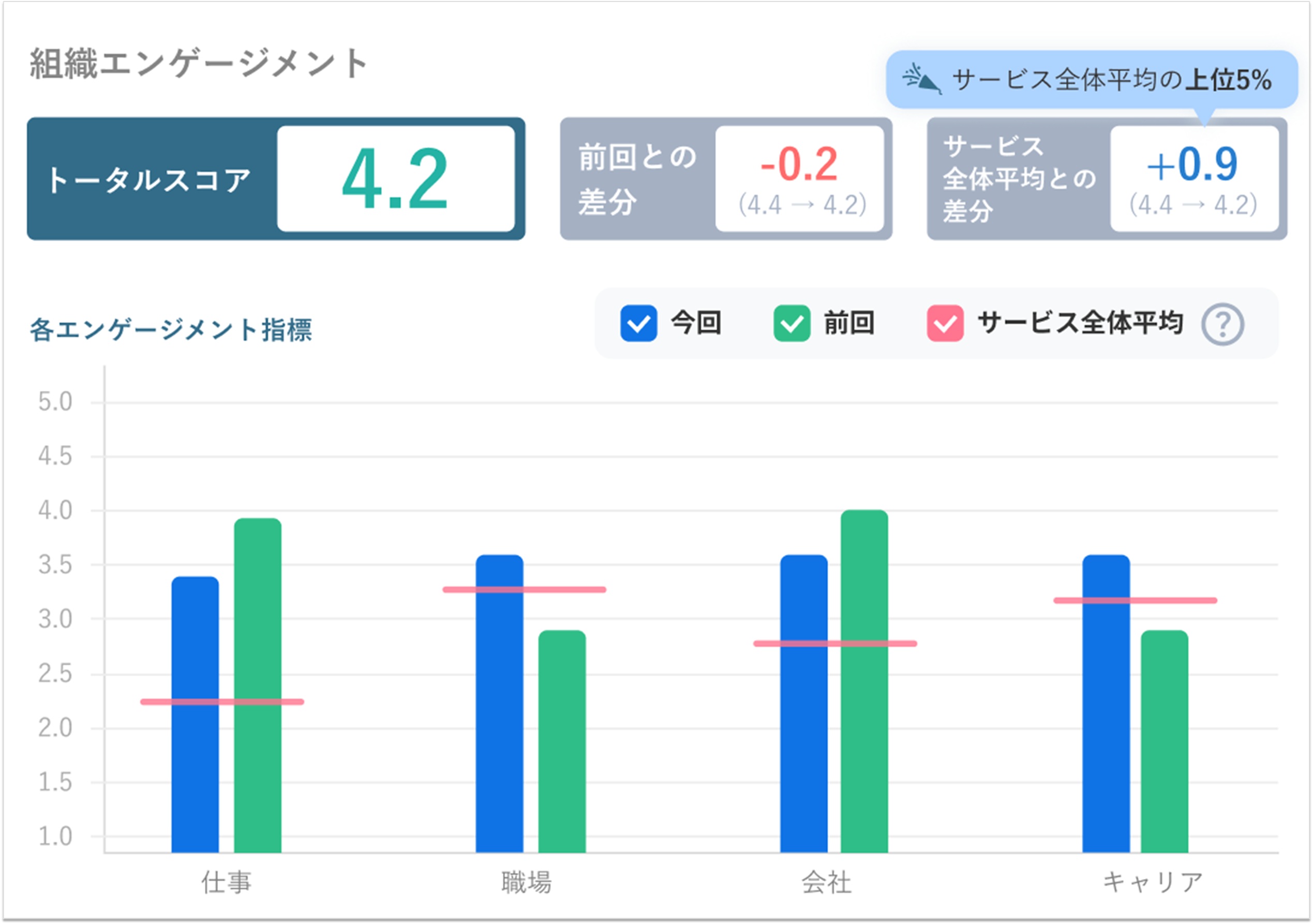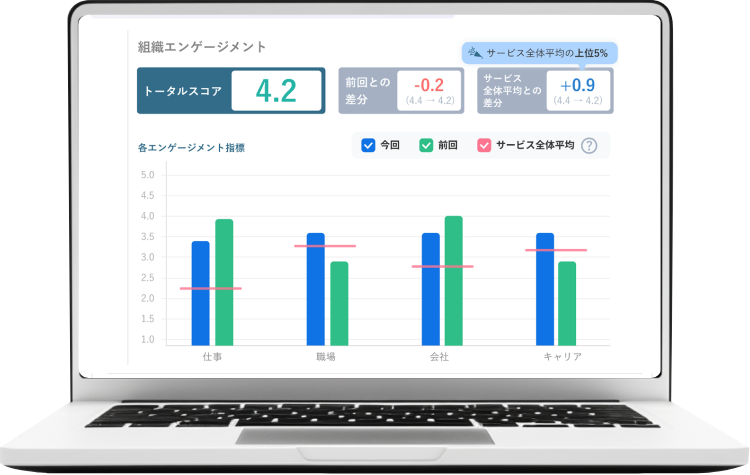 ダッシュボードでは過去の推移やスコア差分を直感的に確認することができ、組織エンゲージメントと個人のワークメンタリティの両面の変化をタイムリーに捉えられます。また、リファレンスデータとの比較も可能です